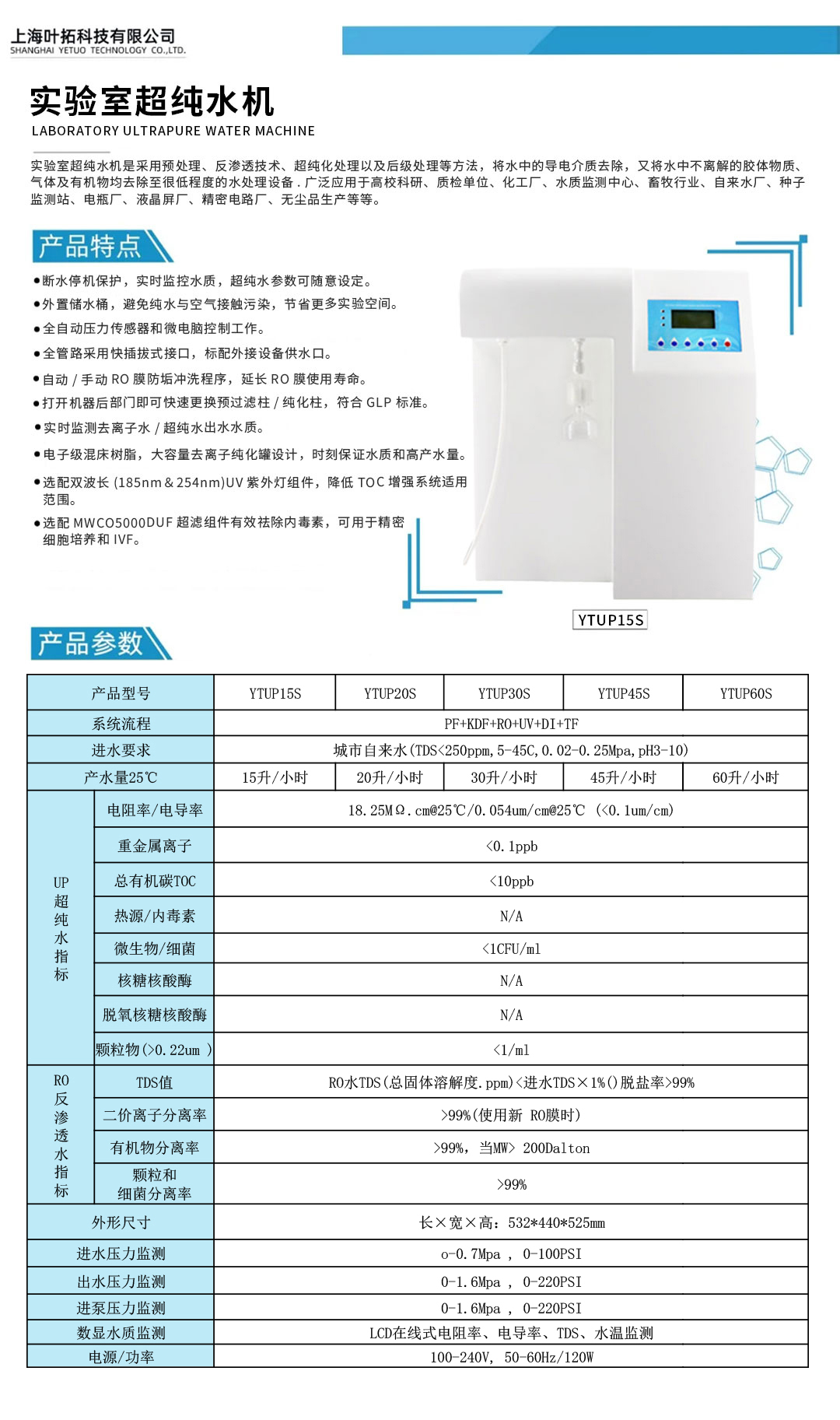上海葉拓 YTUP45S 標(biāo)準(zhǔn)型純水機(jī)